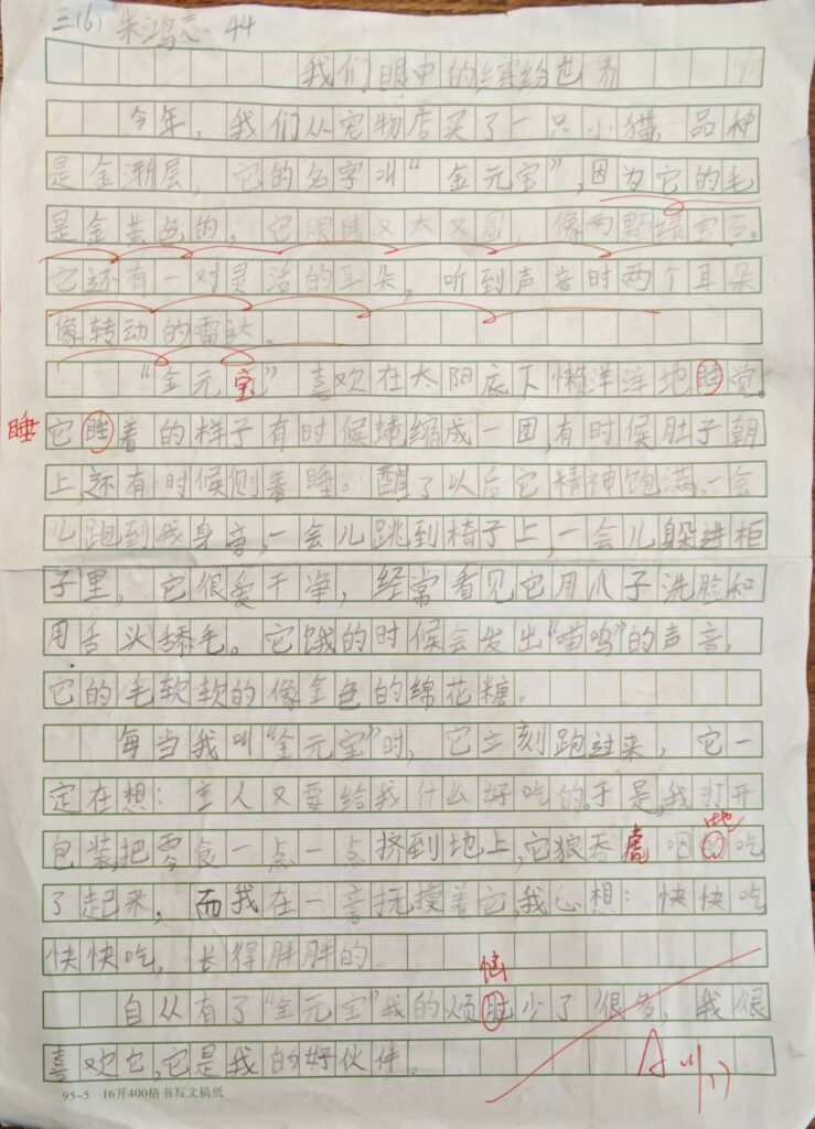 今年我们从宠物店买了一只小猫,品种是金渐层,它的名字叫“金元宝”,因为它的毛是金黄色的,它眼睛又大又圆,像两颗绿宝石,它还有一对灵活的耳朵,听到声音时,两个耳朵像转动的雷达。