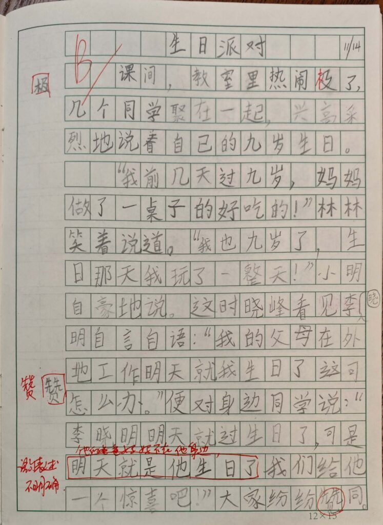 “我前几天过九岁,妈妈做了一桌子的好吃的!”林林笑着说道。“我也九岁了,生日那天我玩了一整天!”小明自豪地说。这时晓峰看见李晓明自言自语:“我的父母在外地工作,明天就我生日了,这可怎么办?”便对身边同学说:“李晓明明天就过生日了,可是他的爸爸发妈不在他身边,我们给他一个惊喜吧!”大家纷纷赞同。