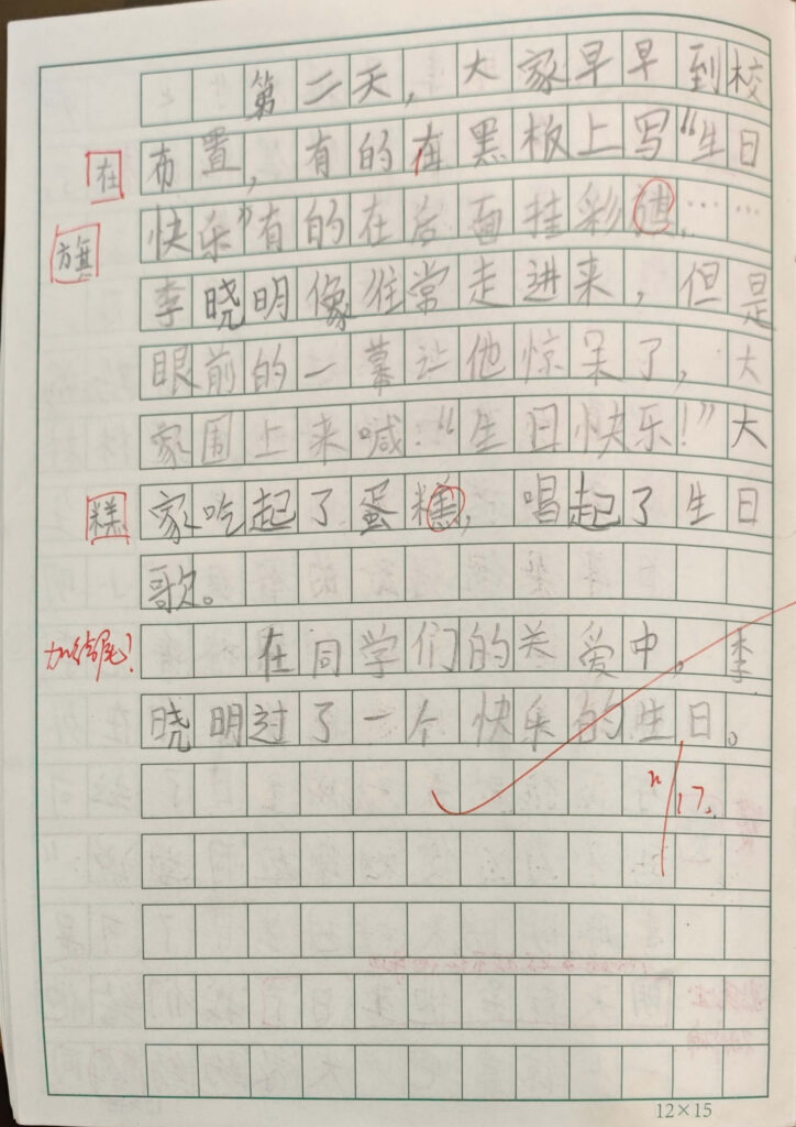 第二天,大家早早到校布置,有的在黑板上写“生日快乐”,有的在后面挂彩旗……李晓明像往常起进来,但是眼前的一幕让他惊呆了,大家围上来喊:“生日快乐!”大家吃起了蛋糕,唱起了生日歌。