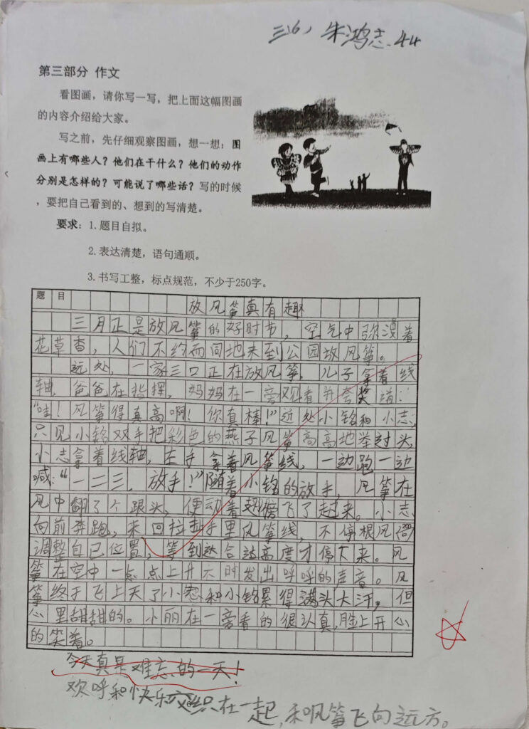 远处,一家三口正在放风筝,儿子拿着线轴,爸爸在指挥,妈妈在一旁观看并夸奖道:“哇!风筝飞得真高啊!你真棒!”近处小铭和小志,只见小铭双手把彩色的燕子风筝高高地举过头,小志拿着线轴,左手拿着风筝线,一边跑一边喊:“一二三,放手!”随着小铭的放手,风筝在风中翻了个跟头,便动着翅膀飞了起来,小志向前奔跑,来回拉扯手里风筝线,不停跟风向调整自己位置,等到达合适高度才停下来。风筝在空中一点点上升,不时发出呼呼的声音。风筝终于飞上天了,小志和小铭累得满头大汗,但心里甜甜的。小丽在一旁看得很认真,脸上开心地笑着。