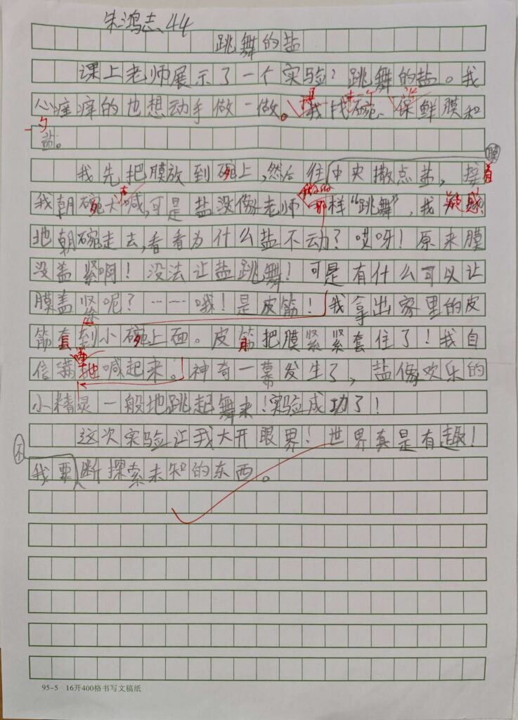 先把膜放到碗上,然后往膜中央撒点盐,接着我朝碗大声喊,可是盐没像老师做的那样“跳舞”。我疑惑地朝碗走去,看看为什么盐不动?哎呀!原来膜没盖紧啊!没法让盐跳舞!可是有什么可以让膜盖紧呢?……哦!是皮筋!